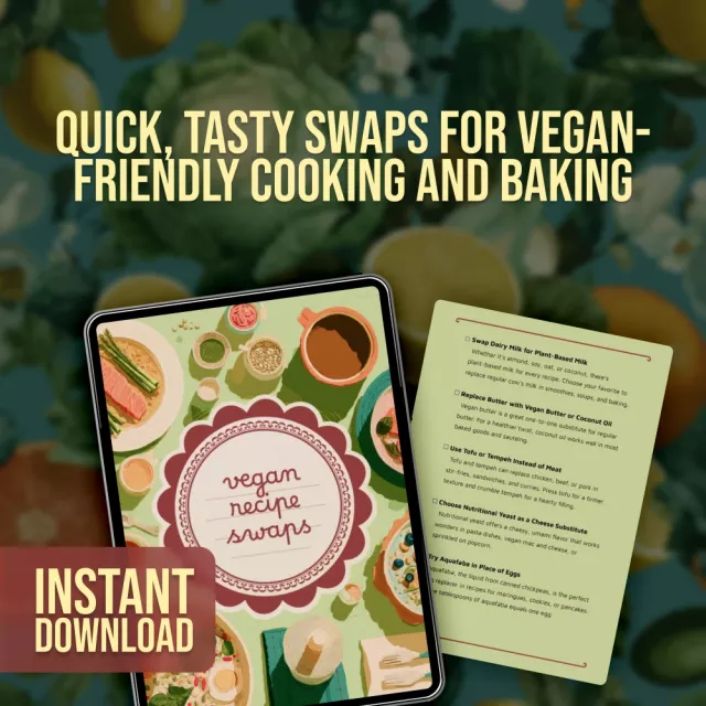 Download your Vegan Recipe Swaps checklist today and start transforming your favorite meals into flavorful, plant-based dishes with ease. Click “Add to Cart” now and make every recipe a vegan success!